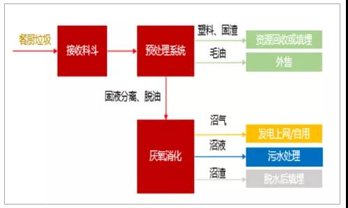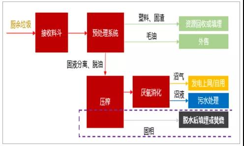餐廚垃圾的特點包括有機物含量高,含水率高,易腐爛變質(zhì),易發(fā)酵、發(fā)臭,主要是采用厭氧消化、好氧堆肥和飼料化工藝等生物法進(jìn)行處理。其中厭氧消化工藝能最大化回收油脂,無害化程度高,并能夠充分地對餐廚垃圾中的有機物進(jìn)行資源化回收和利用,已經(jīng)有超過70%的餐廚垃圾處理項目使用這條技術(shù)路線,是現(xiàn)階段的主流工藝路線。