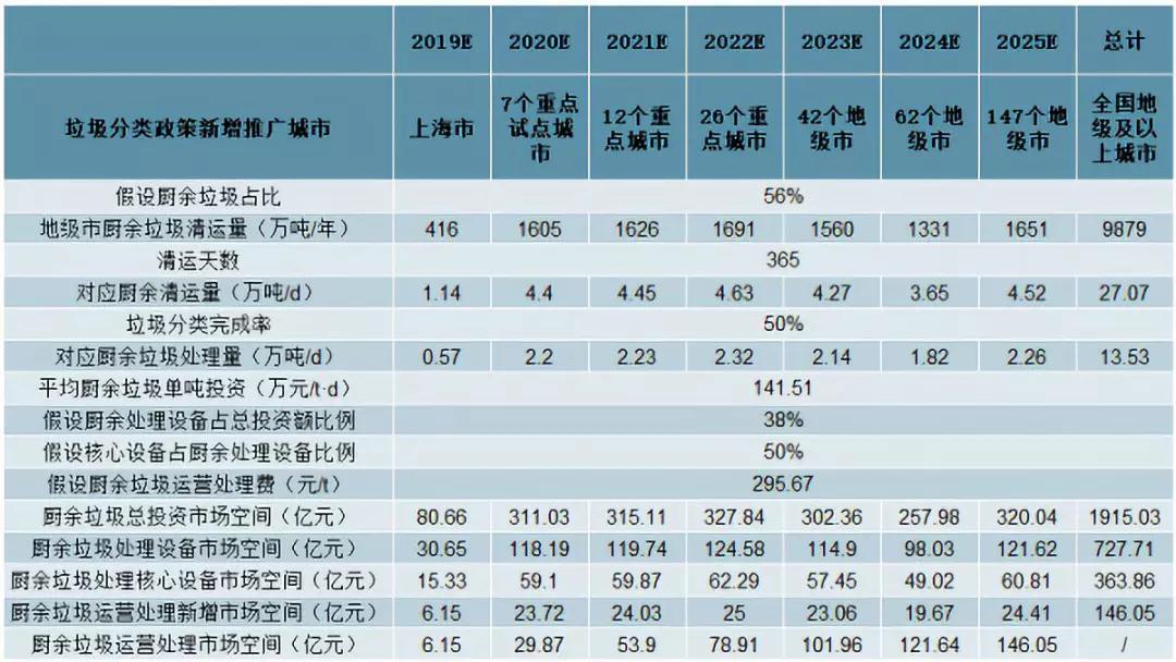各地級城市垃圾分類推廣節(jié)奏逐步釋放。我們依據(jù)各城市已推行的垃圾分類政策及各城市生活垃圾清運量及處置規(guī)模等屬性推測垃圾分類政策推行進(jìn)度。考慮到政策實際推行情況,保守假設(shè)垃圾分類年化市場釋放節(jié)奏為:2019年上海;2020年北京/南京/成都/深圳等7個重點城市;2021年重慶/天津/蘇州等12個重點城市;2022年46個重點城市中剩余的26個重點城市;2023年保定/大同/吉林等42個地級市;2024年邢臺/淮安/九江等62個地級市;2025年剩余的地級市。在空間測算中均以該推廣節(jié)奏為前提進(jìn)行測算。